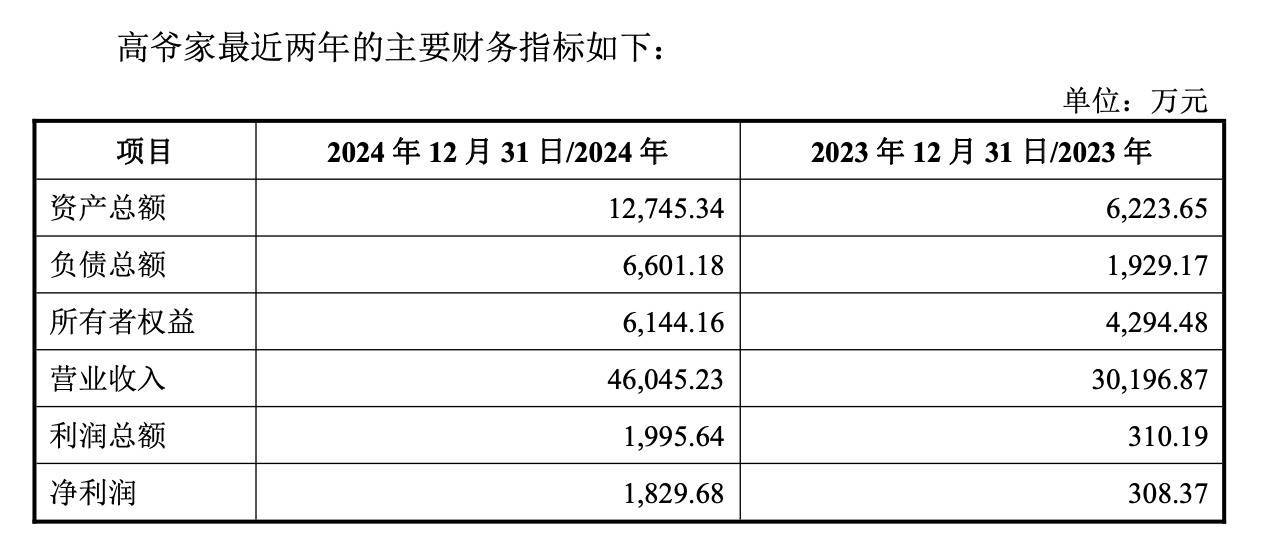 从业绩表现看,高爷家在2023年-2024年分别实现营收3.02亿元、4.60亿元,净利润则从308.37万元增长至1829.68万元,也就是说公司两年累计净利润约0.21亿元。